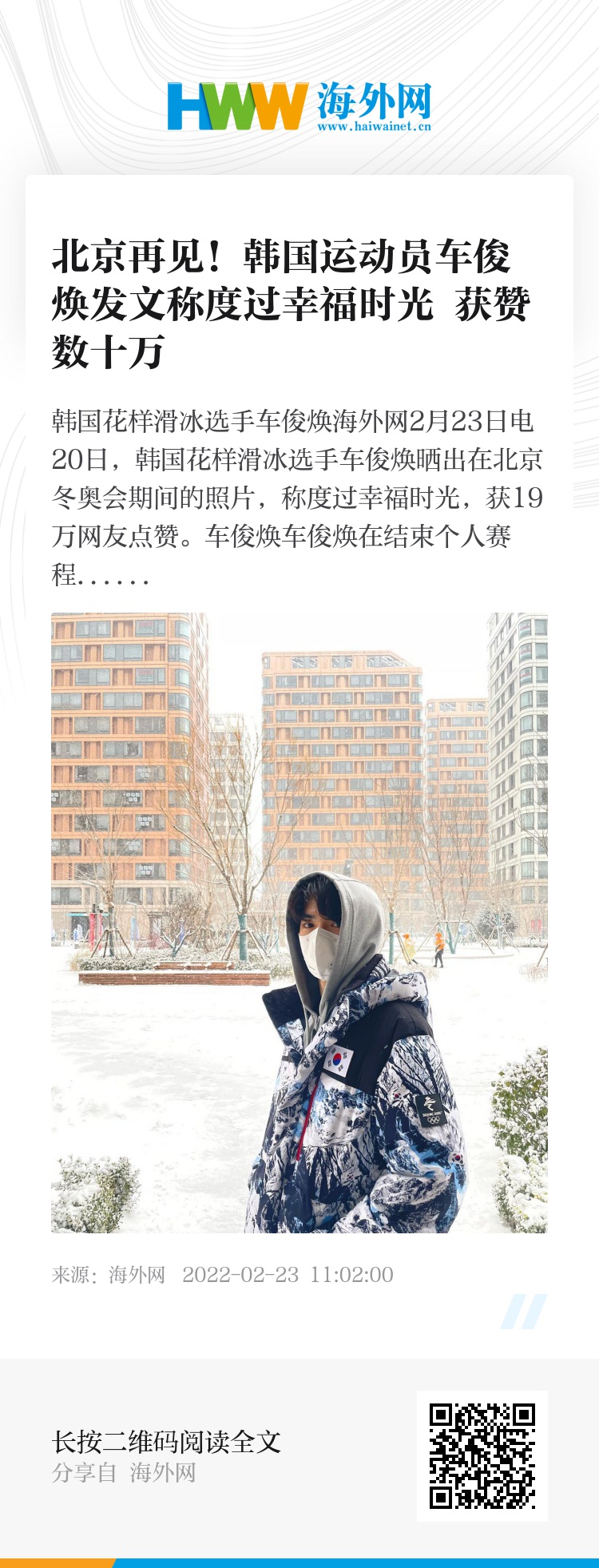 海外网2月23日电 20日,韩国花样滑冰选手车俊焕晒出在北京冬奥会期间的照片,称度过幸福时光,获19万网友点赞。