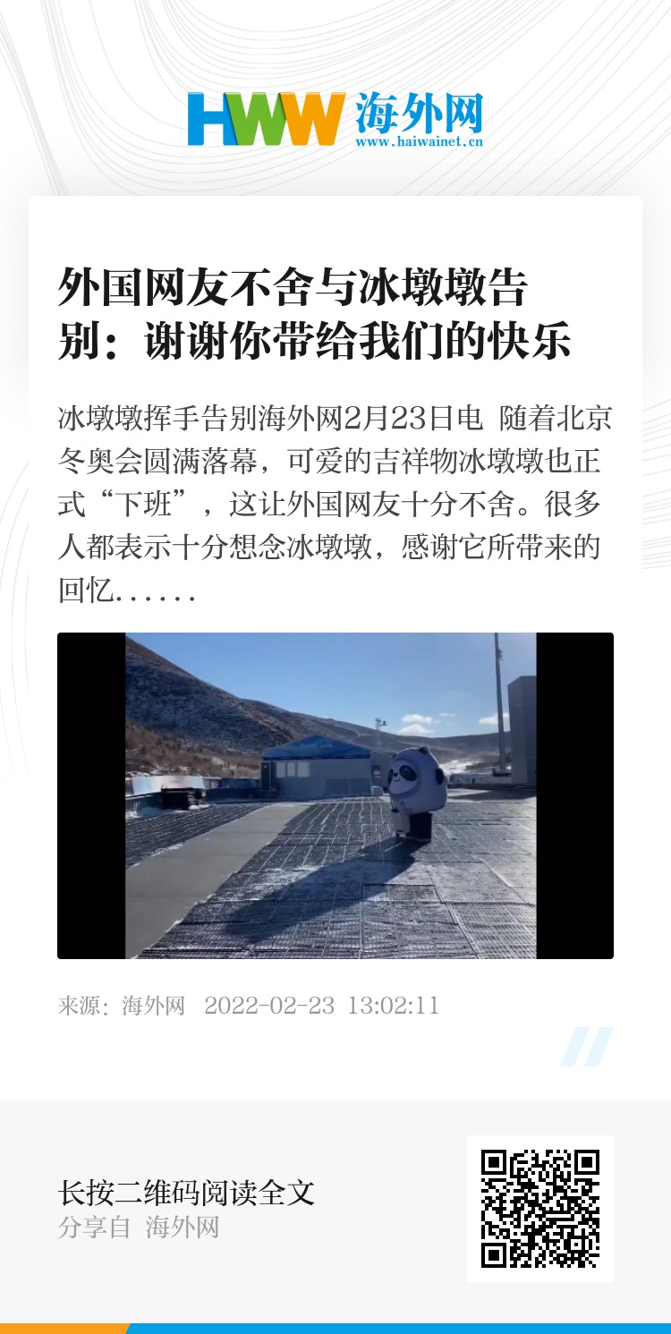 海外网2月23日电 随着北京冬奥会圆满落幕,可爱的吉祥物冰墩墩也正式“下班”,这让外国网友十分不舍。很多人都表示十分想念冰墩墩,感谢它所带来的回忆和快乐。
