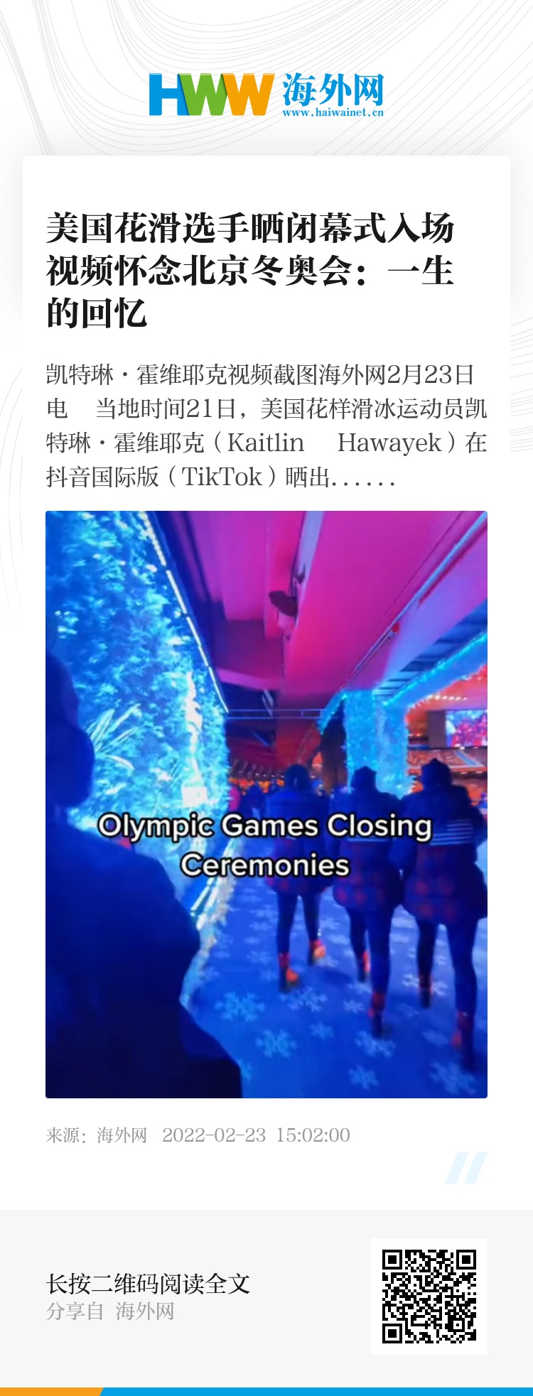 海外网2月23日电 当地时间21日,美国花样滑冰运动员凯特琳·霍维耶克(Kaitlin Hawayek)在抖音国际版(TikTok)晒出参加北京冬奥会闭幕式的视频,称这是一生的回忆。