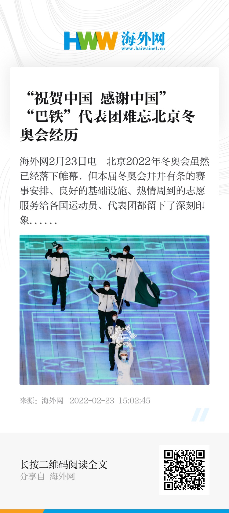 巴基斯坦《每日时报》21日发表题为《巴基斯坦代表团祝贺中国成功举办冬奥会》的文章称,巴基斯坦代表团成员对中国成功举办北京冬奥会付出的努力表示感谢。