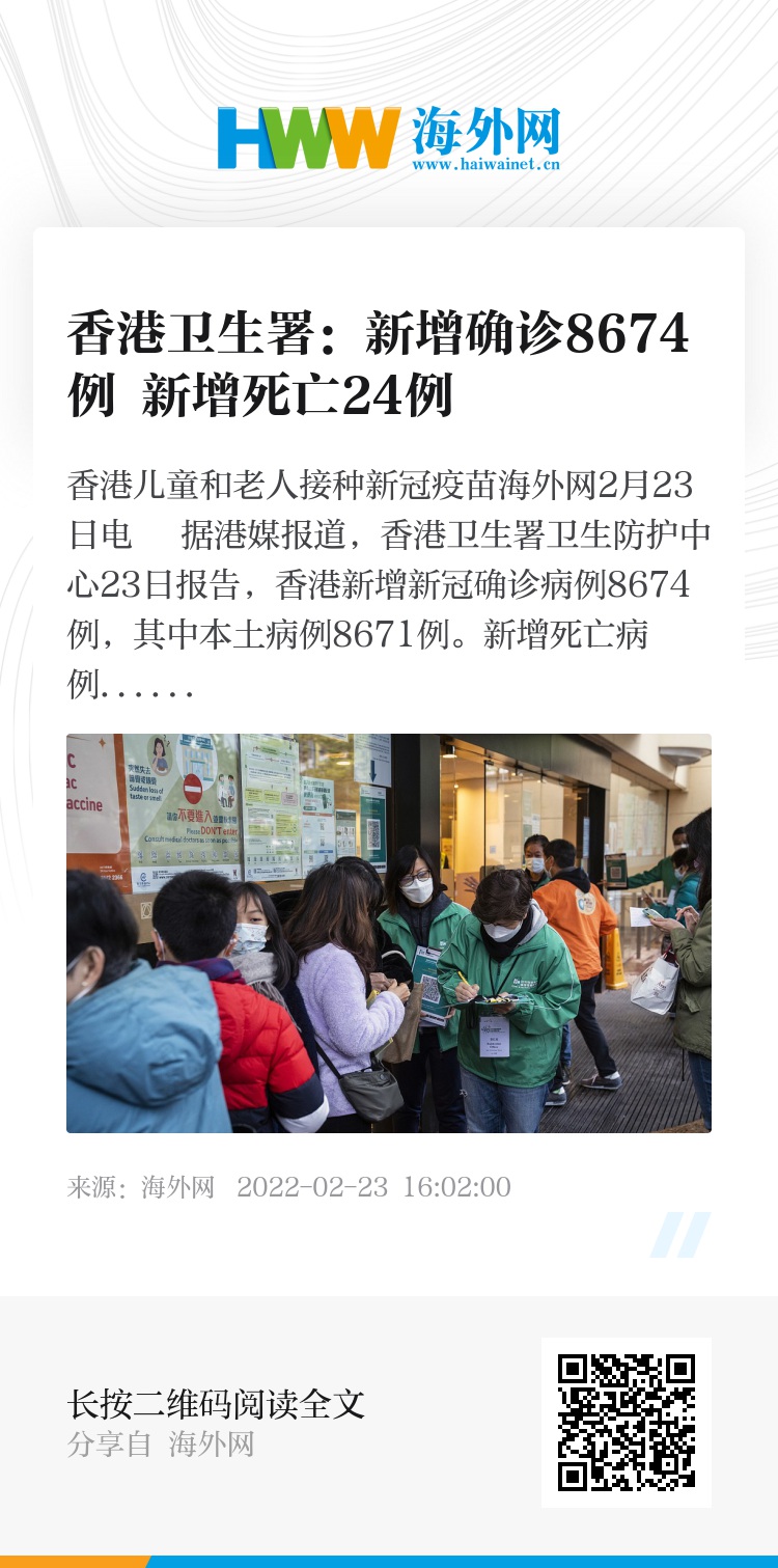海外网2月23日电 据港媒报道,香港卫生署卫生防护中心23日报告,香港新增新冠确诊病例8674例,其中本土病例8671例。新增死亡病例24例,为16男8女,年龄介于52至97岁,15人来自安老院舍。(海外网 汪晓宇)