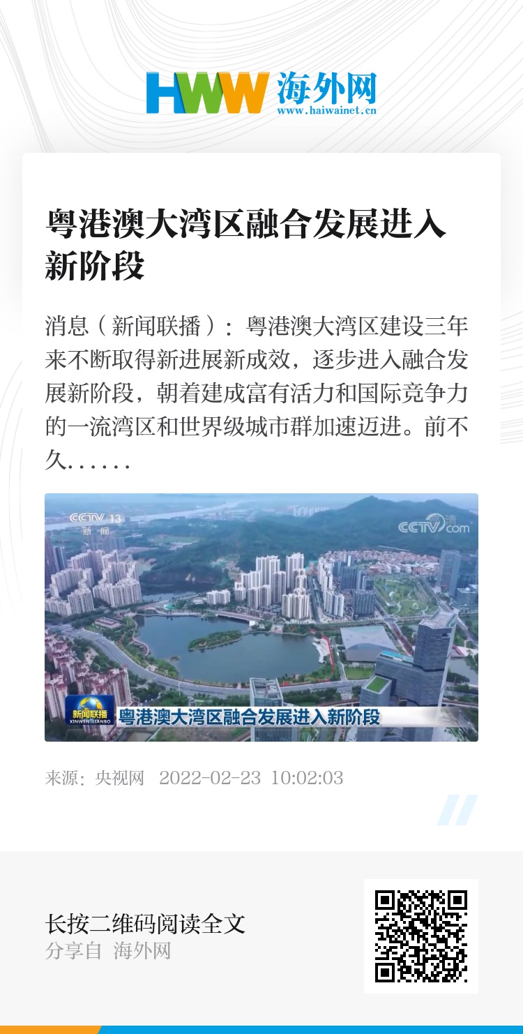 央视网消息(新闻联播):粤港澳大湾区建设三年来不断取得新进展新成效,逐步进入融合发展新阶段,朝着建成富有活力和国际竞争力的一流湾区和世界级城市群加速迈进。