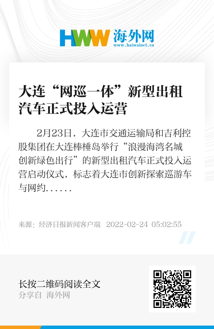 2月23日,大连市交通运输局和吉利控股集团在大连棒棰岛举行“浪漫海湾名城・创新绿色出行”的新型出租汽车正式投入运营启动仪式,标志着大连市创新探索巡游车与网约车融合发展迈出关键一步。