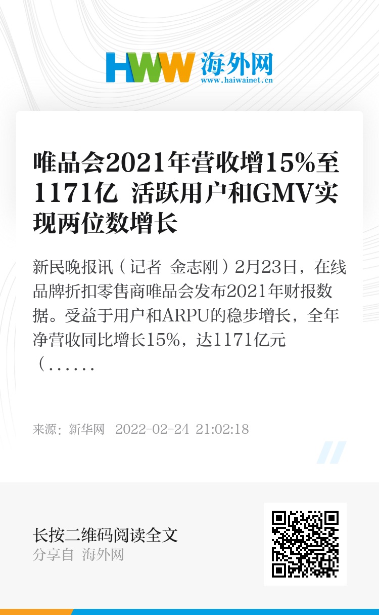 新民晚报讯(记者 金志刚)2月23日,在线品牌折扣零售商唯品会发布2021年财报数据。受益于用户和ARPU的稳步增长,全年净营收同比增长15%,达1171亿元(人民币,下同);Non-GAAP净利润超过60亿元。整体业务实现稳健增长。