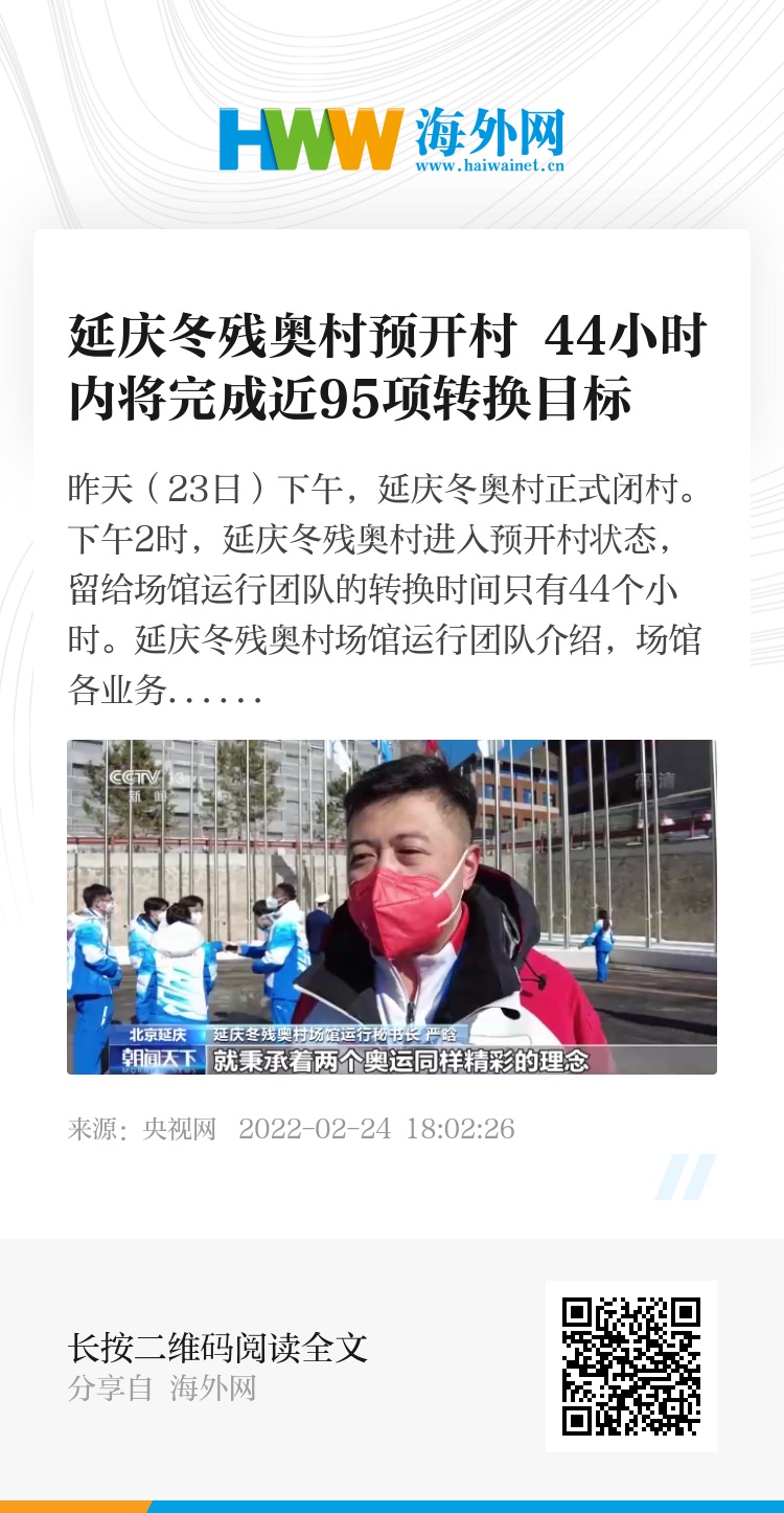 昨天(23日)下午,延庆冬奥村正式闭村。下午2时,延庆冬残奥村进入预开村状态,留给场馆运行团队的转换时间只有44个小时。
