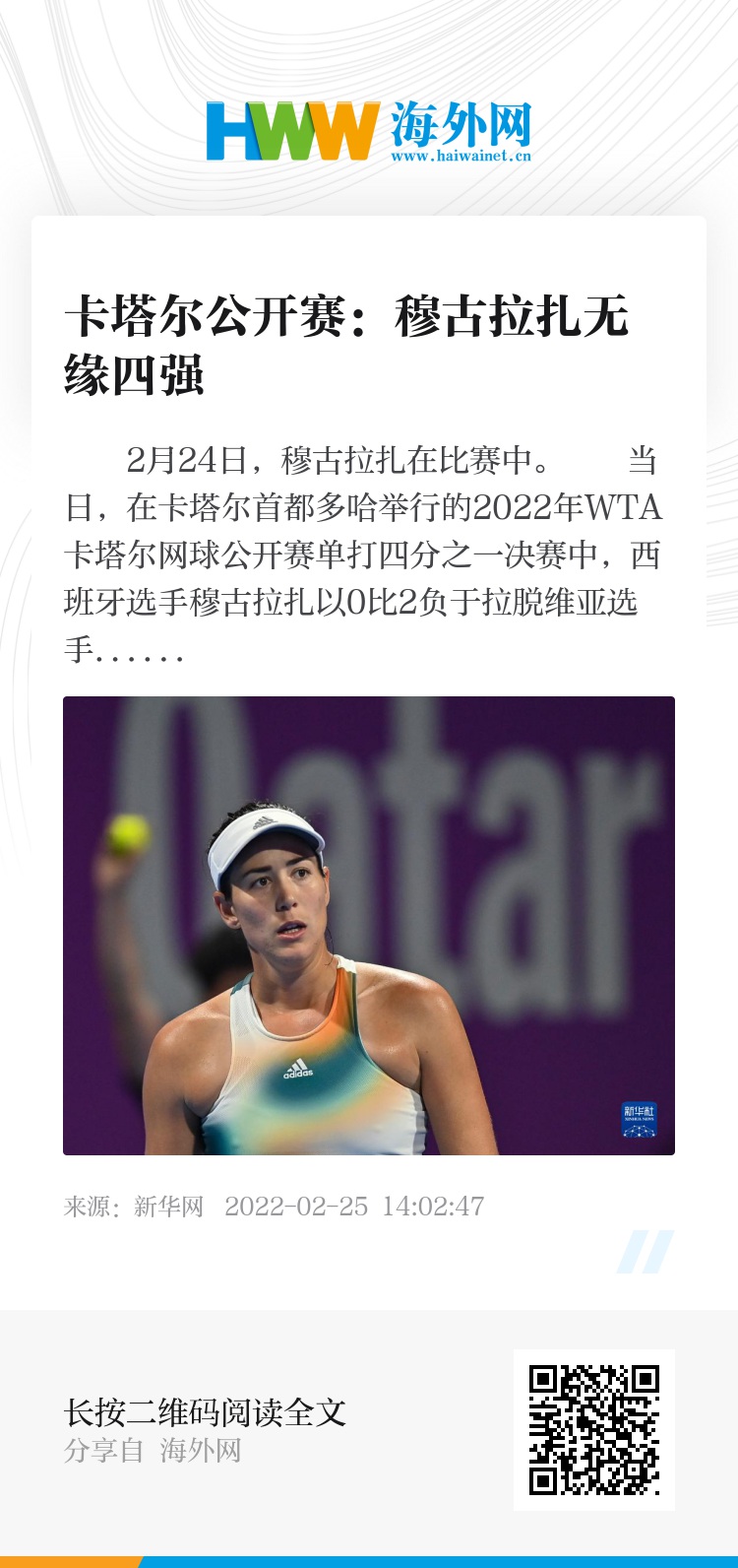 当日,在卡塔尔首都多哈举行的2022年WTA卡塔尔网球公开赛单打四分之一决赛中,西班牙选手穆古拉扎以0比2负于拉脱维亚选手奥斯塔彭科,无缘四强。