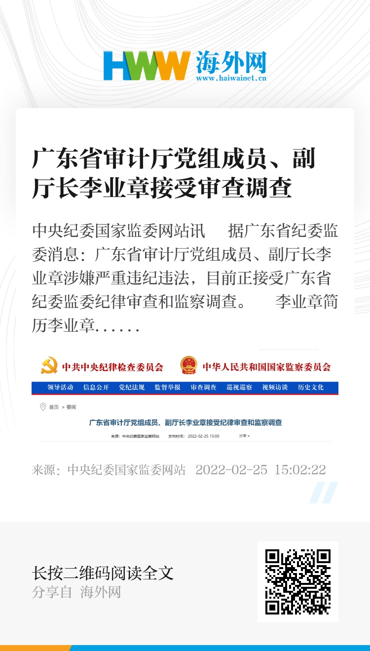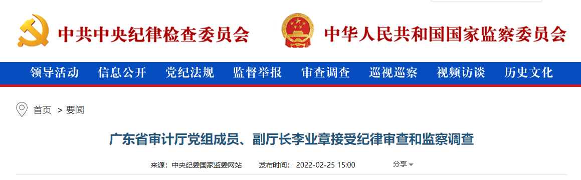 中央纪委国家监委网站讯 据广东省纪委监委消息:广东省审计厅党组成员、副厅长李业章涉嫌严重违纪违法,目前正接受广东省纪委监委纪律审查和监察调查。