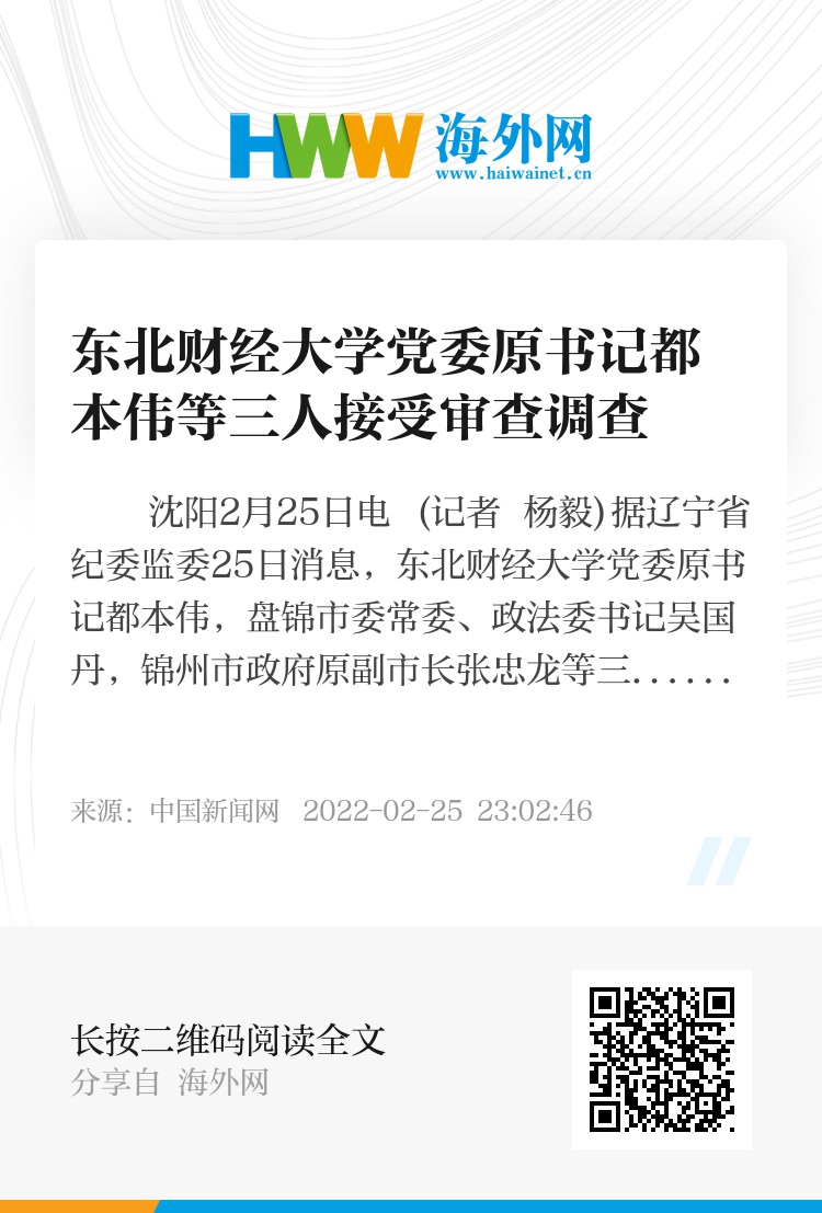 中新网沈阳2月25日电 (记者 杨毅)据辽宁省纪委监委25日消息,东北财经大学党委原书记都本伟,盘锦市委常委、政法委书记吴国丹,锦州市政府原副市长张忠龙等三人涉嫌严重违纪违法,目前正接受纪律审查和监察调查。