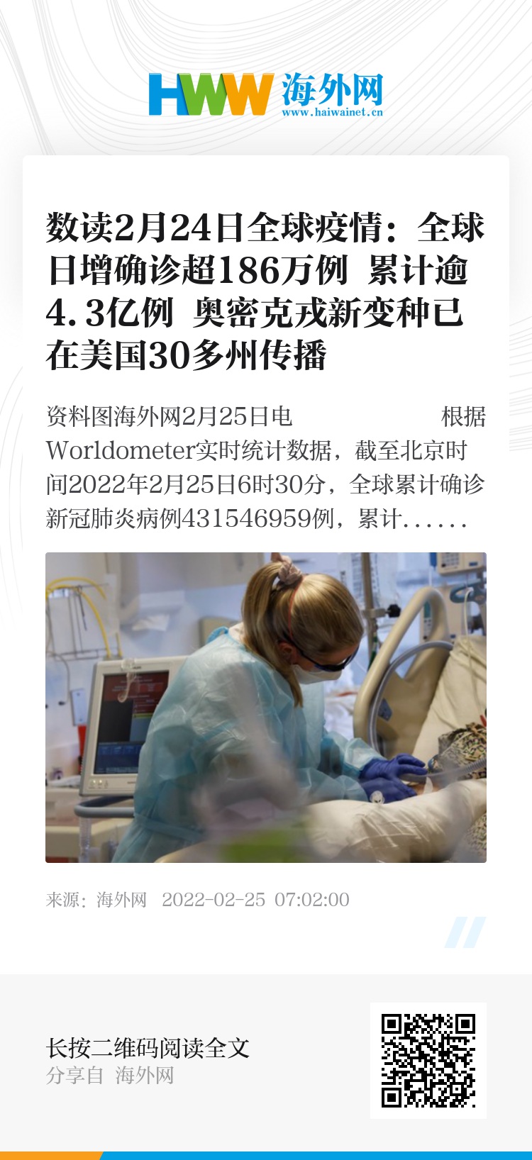 海外网2月25日电 根据Worldometer实时统计数据,截至北京时间2022年2月25日6时30分,全球累计确诊新冠肺炎病例431546959例,累计死亡病例5944491例。全球单日新增确诊病例1861232例,新增死亡病例10678例。