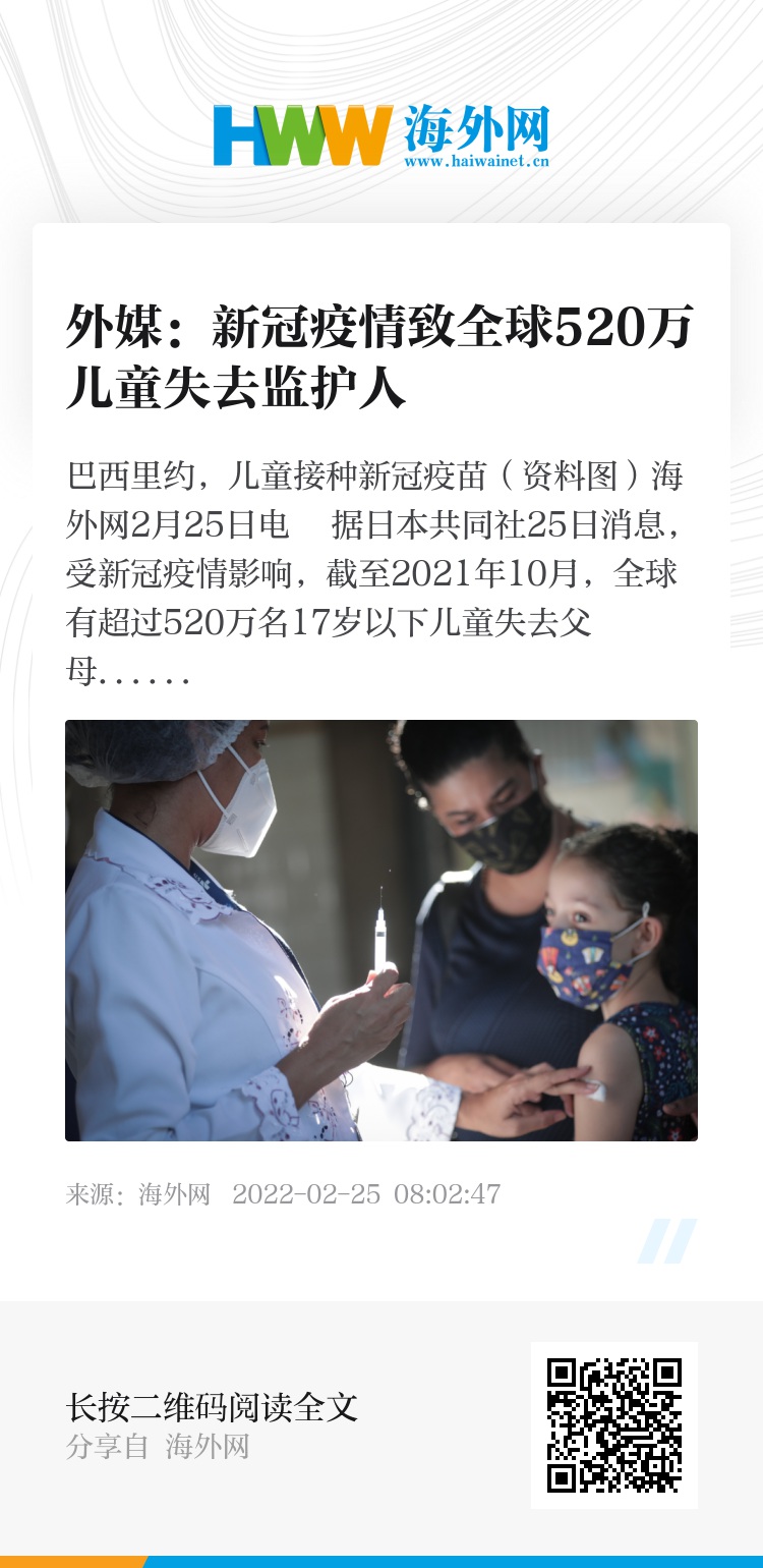 海外网2月25日电 据日本共同社25日消息,受新冠疫情影响,截至2021年10月,全球有超过520万名17岁以下儿童失去父母、祖父母等监护人。该数据由美国疾控中心等组成的国际机构24日在英国医学杂志公布。