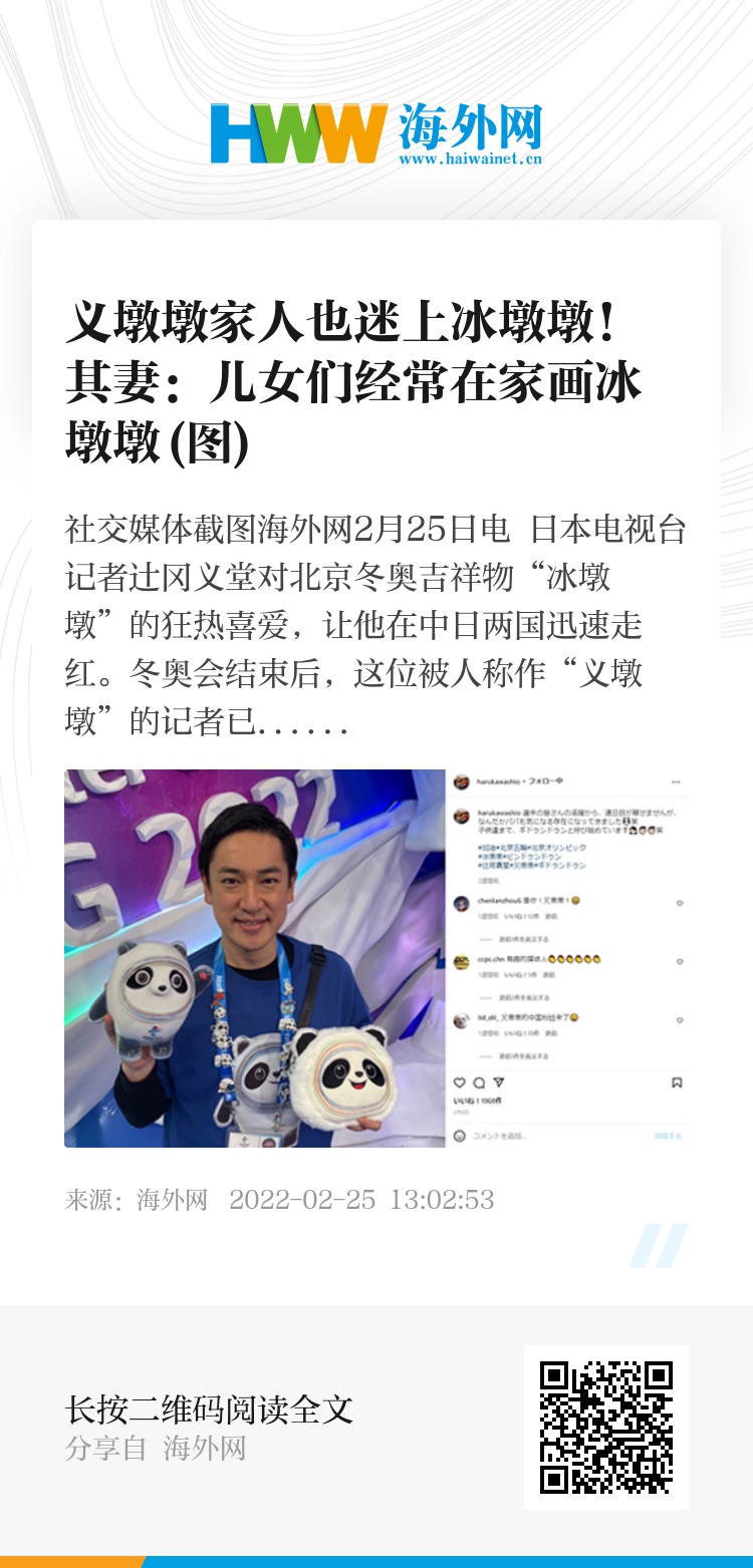 海外网2月25日电 日本电视台记者辻冈义堂对北京冬奥吉祥物“冰墩墩”的狂热喜爱,让他在中日两国迅速走红。冬奥会结束后,这位被人称作“义墩墩”的记者已回国,其妻子日前在社交媒体表示,两个孩子深受爸爸影响,也对“冰墩墩”情有独钟,经常在家画“冰墩墩”。