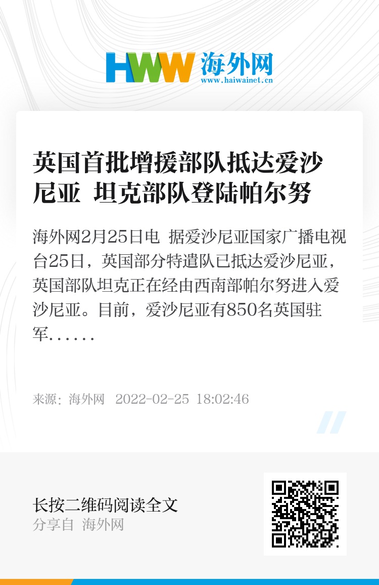 目前,爱沙尼亚有850名英国驻军。英国上周表示,将向爱沙尼亚增派1000名军事人员,包含3个兵种,此外还提供坦克和装甲车等军事设备。