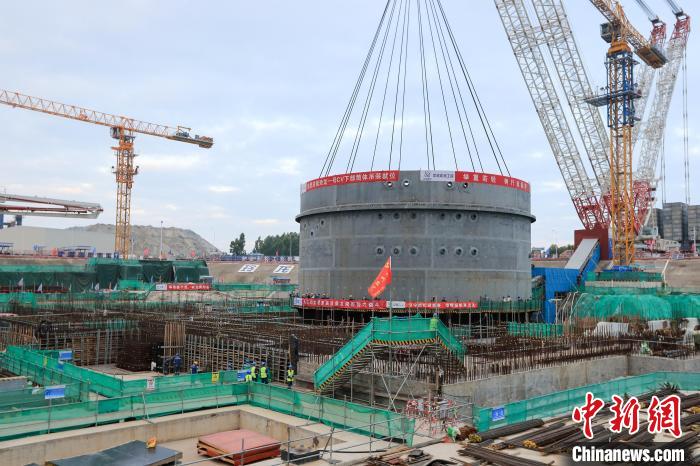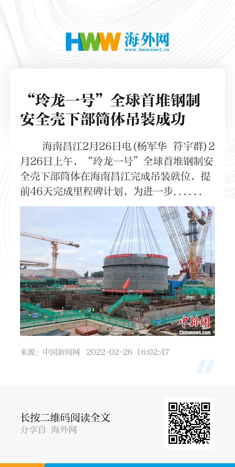 中新网海南昌江2月26日电(杨军华 符宇群)2月26日上午,“玲龙一号”全球首堆钢制安全壳下部筒体在海南昌江完成吊装就位,提前46天完成里程碑计划,为进一步高质量稳步推进小堆工程建设奠定了坚实基础。