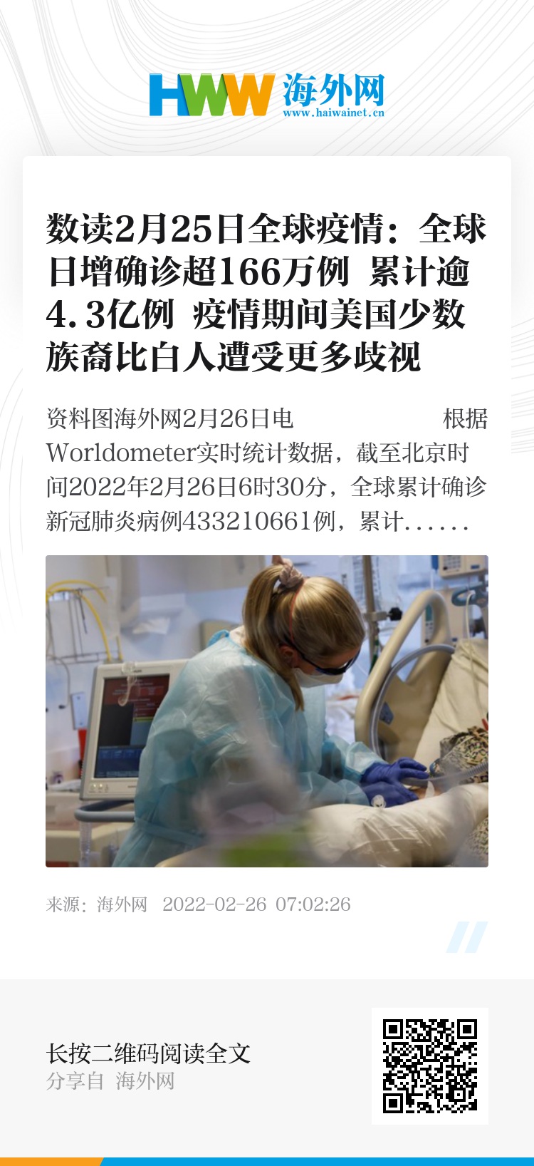 海外网2月26日电 根据Worldometer实时统计数据,截至北京时间2022年2月26日6时30分,全球累计确诊新冠肺炎病例433210661例,累计死亡病例5954777例。全球单日新增确诊病例1663702例,新增死亡病例10286例。