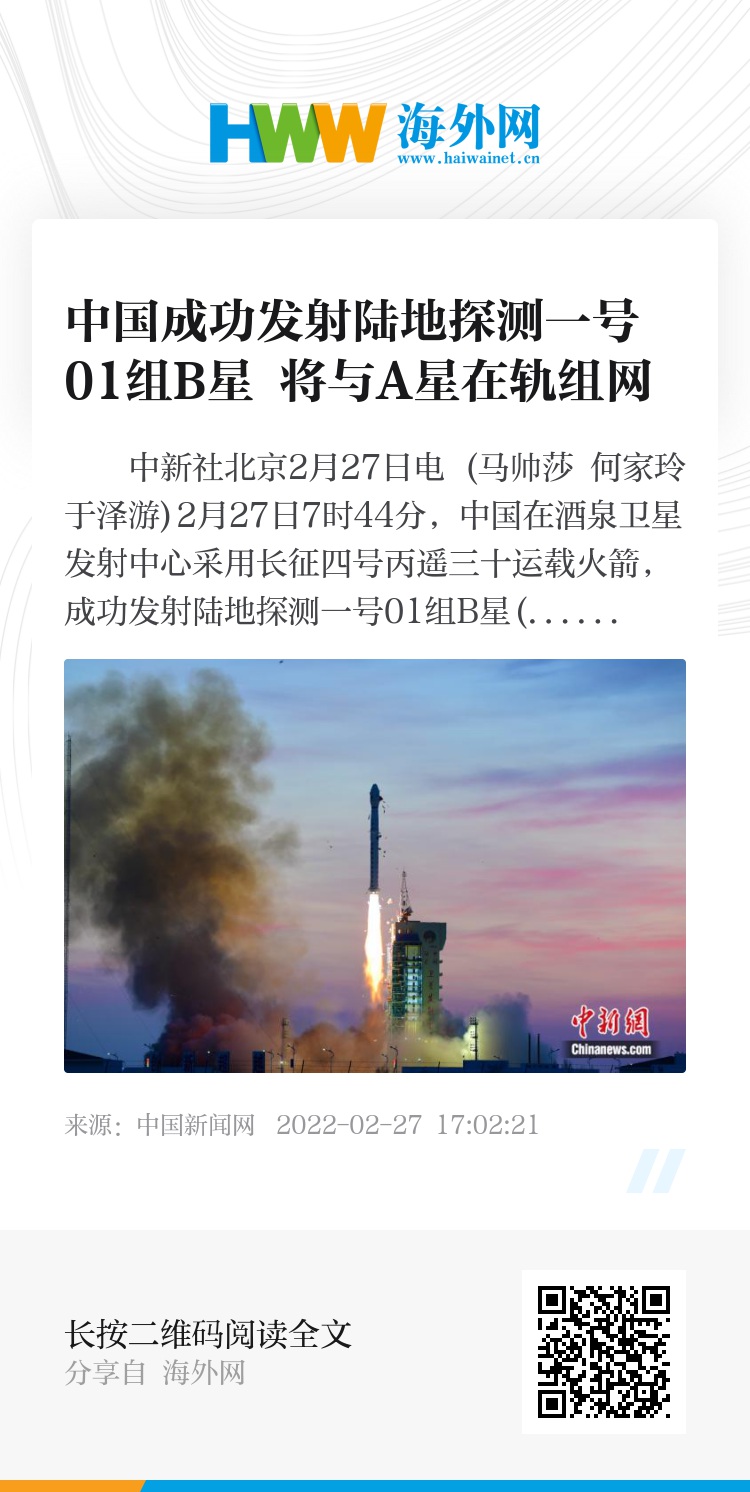 中新社北京2月27日电 (马帅莎 何家玲 于泽游)2月27日7时44分,中国在酒泉卫星发射中心采用长征四号丙遥三十运载火箭,成功发射陆地探测一号01组B星(又称:L波段差分干涉合成孔径雷达卫星B星)。