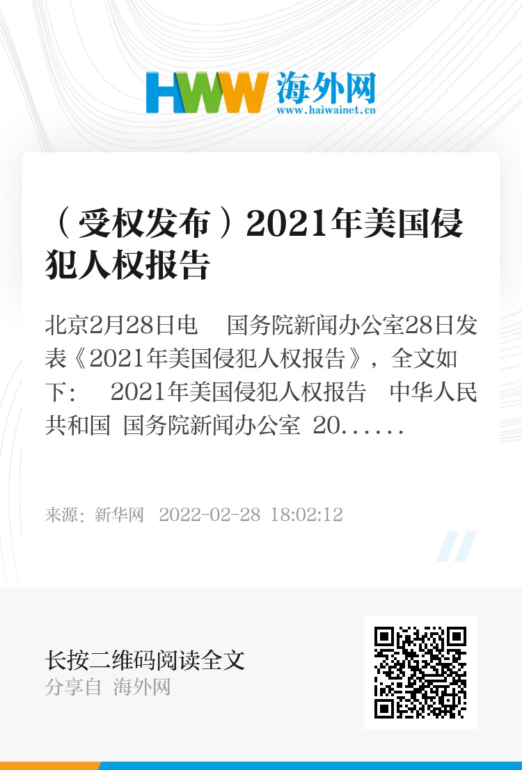 新华社北京2月28日电 国务院新闻办公室28日发表《2021年美国侵犯人权报告》,全文如下: