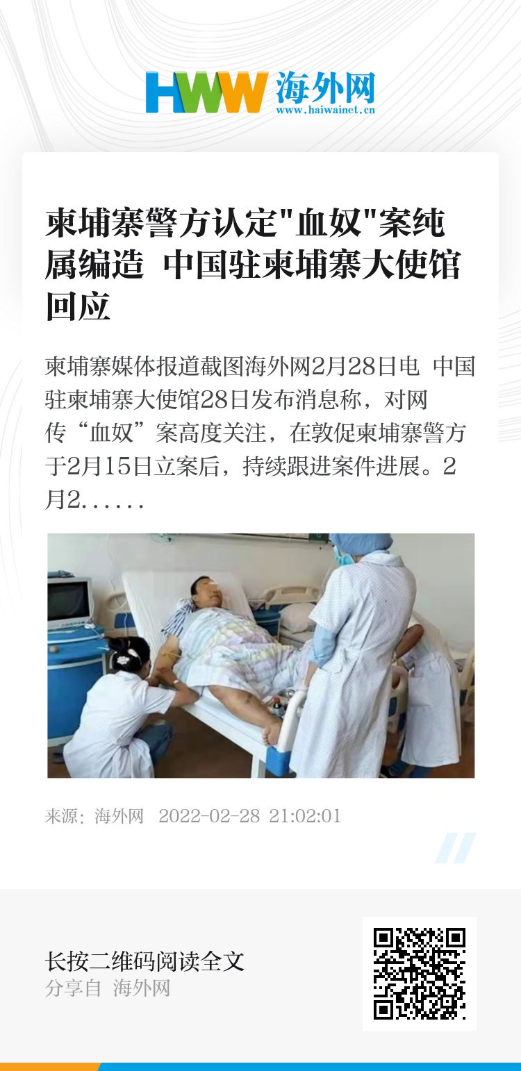 海外网2月28日电 中国驻柬埔寨大使馆28日发布消息称,对网传“血奴”案高度关注,在敦促柬埔寨警方于2月15日立案后,持续跟进案件进展。2月28日,柬警方通报了初步调查结果并发布公告,认定所谓“血奴”案纯属编造。