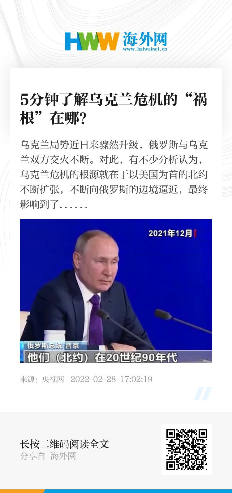 俄罗斯总统 普京(2021年12月):他们(北约)在20世纪90年代,对我们承诺不会东扩,结果怎么样呢,我们被骗了,他们厚颜无耻地欺骗了我们,北约东扩了五次,现在罗马尼亚、波兰都部署了导弹系统,这说明什么,不是我们在威胁别人,我们没去美国边境,没去英国边境,是他们来找我们了,现在他们又说乌克兰也要加入北约。
