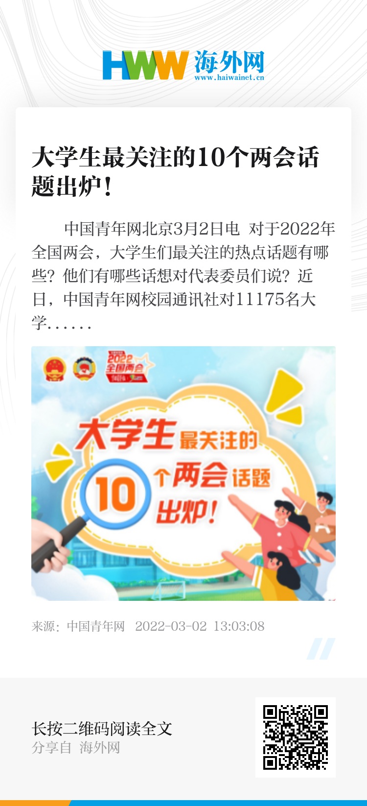 中国青年网北京3月2日电 对于2022年全国两会,大学生们最关注的热点话题有哪些?他们有哪些话想对代表委员们说?近日,中国青年网校园通讯社对11175名大学生进行调研,盘点了大学生关注的十大热点话题,一起来看看吧!
