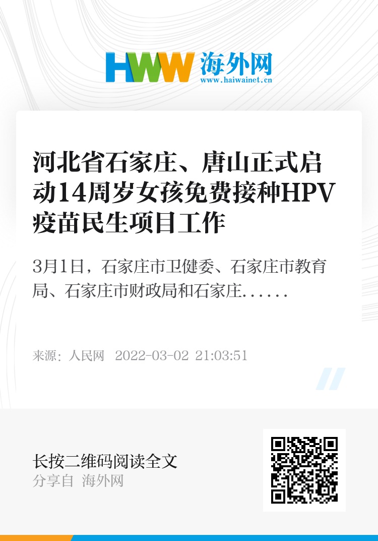 据悉,唐山市也将14岁周岁女孩免费接种HPV疫苗工作纳入2022年民生实事项目,并印发《为全市14周岁女孩免费接种HPV疫苗工作方案》,集中接种工作将在4月1日开始实施。