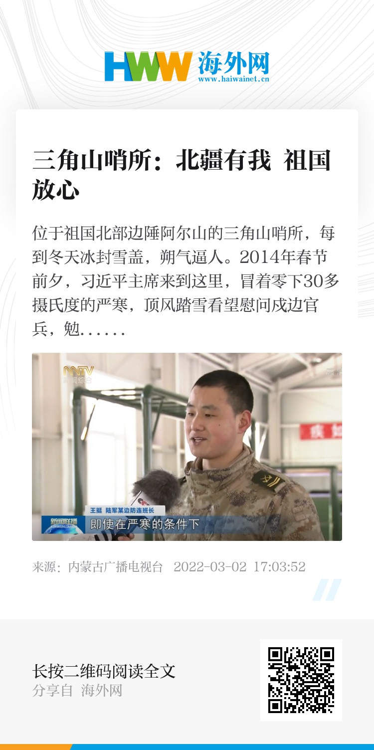 位于祖国北部边陲阿尔山的三角山哨所,每到冬天冰封雪盖,朔气逼人。2014年春节前夕,习近平主席来到这里,冒着零下30多摄氏度的严寒,顶风踏雪看望慰问戍边官兵,勉励大家矢志扎根边防、守卫边防、建功边防。2015年,习近平主席又回信勉励官兵,内蒙古各族干部群众始终牢记习主席嘱托,用热血和忠诚筑牢祖国北疆安全稳定屏障。