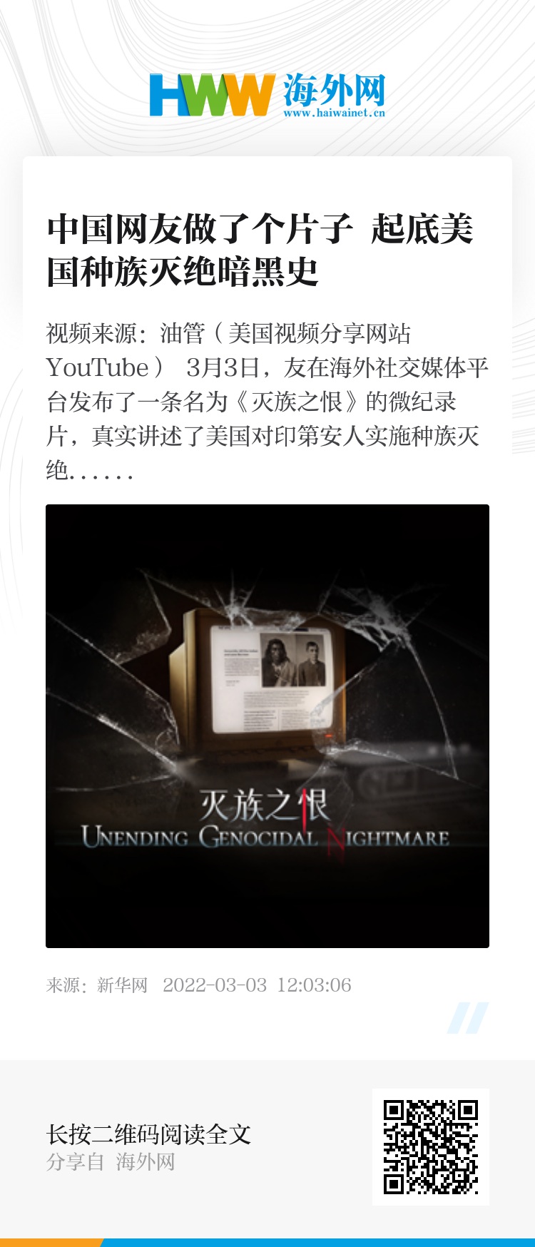 3月3日,中国网友在海外社交媒体平台发布了一条名为《灭族之恨》的微纪录片,真实讲述了美国对印第安人实施种族灭绝的黑暗历史。