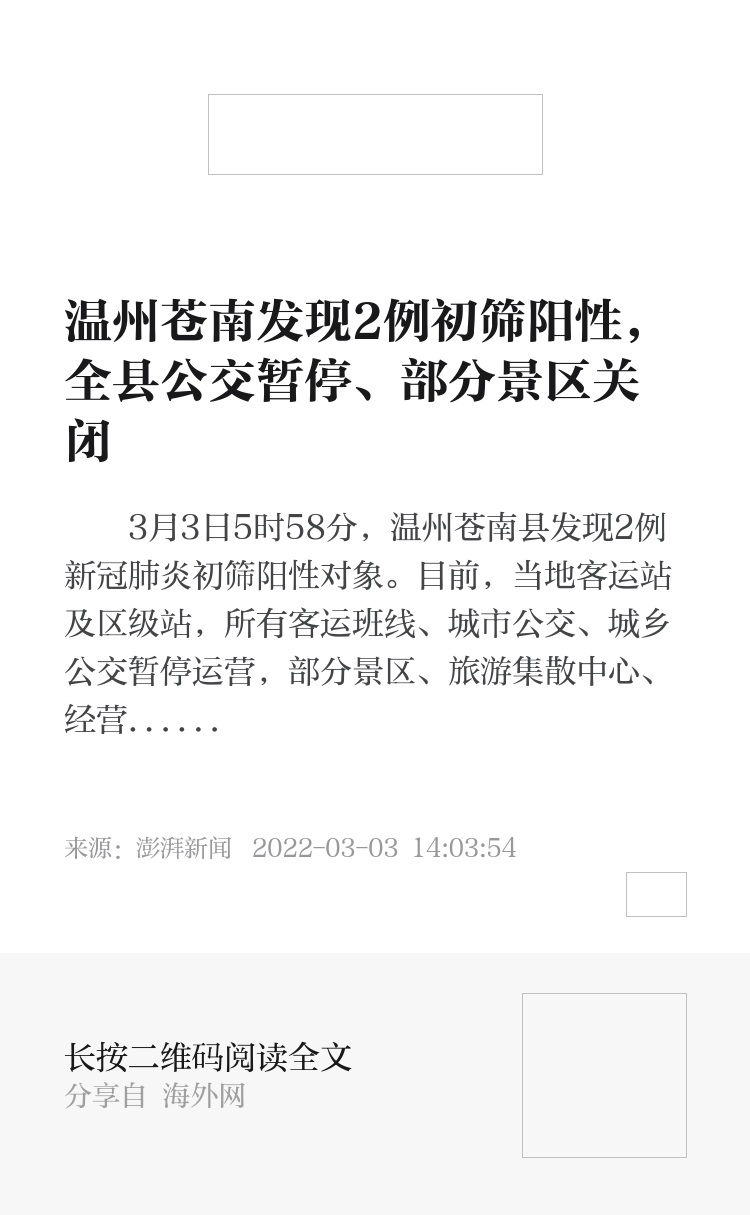 3月3日5时58分,温州苍南县发现2例新冠肺炎初筛阳性对象。目前,当地客运站及区级站,所有客运班线、城市公交、城乡公交暂停运营,部分景区、旅游集散中心、经营场所关闭。
