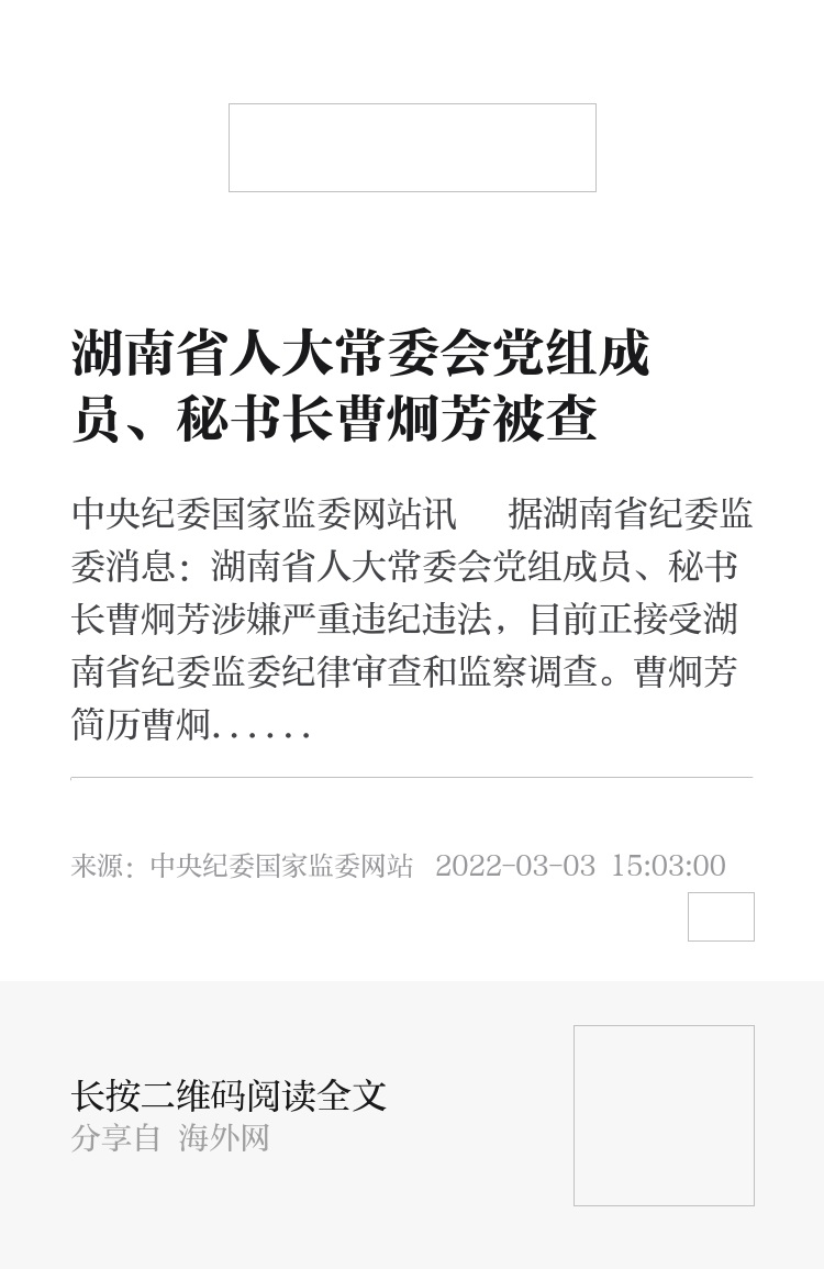 中央纪委国家监委网站讯 据湖南省纪委监委消息:湖南省人大常委会党组成员、秘书长曹炯芳涉嫌严重违纪违法,目前正接受湖南省纪委监委纪律审查和监察调查。