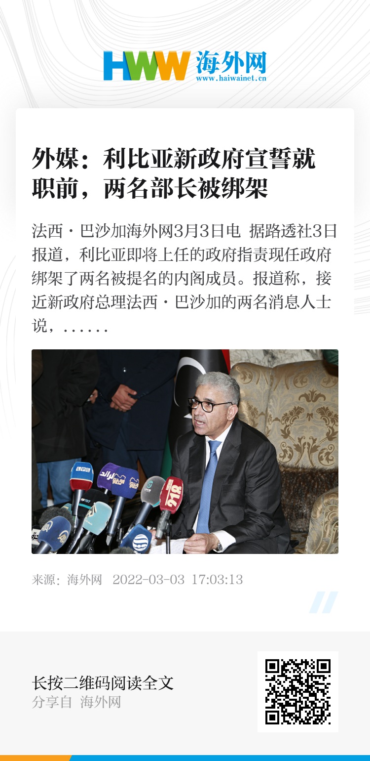海外网3月3日电 据路透社3日报道,利比亚即将上任的政府指责现任政府绑架了两名被提名的内阁成员。
