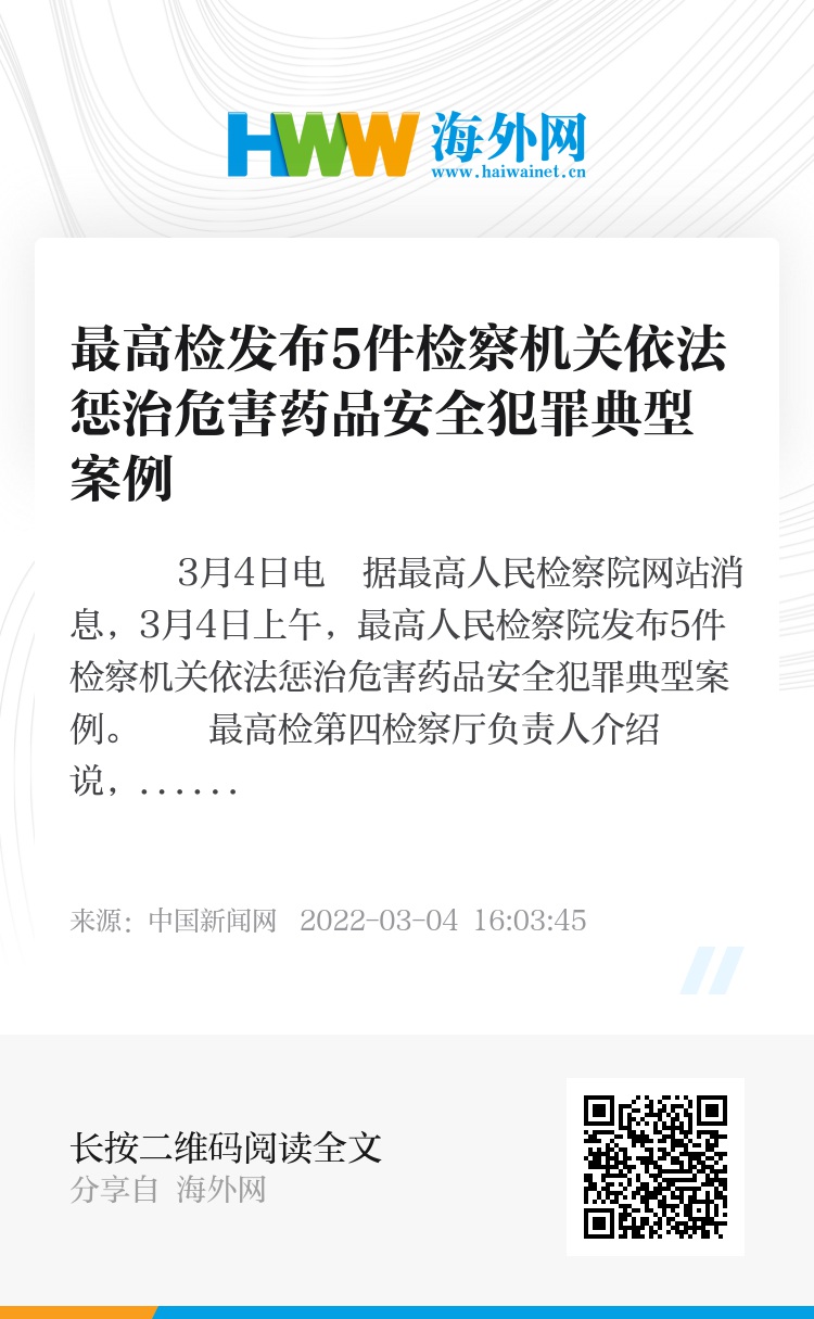 中新网3月4日电 据最高人民检察院网站消息,3月4日上午,最高人民检察院发布5件检察机关依法惩治危害药品安全犯罪典型案例。
