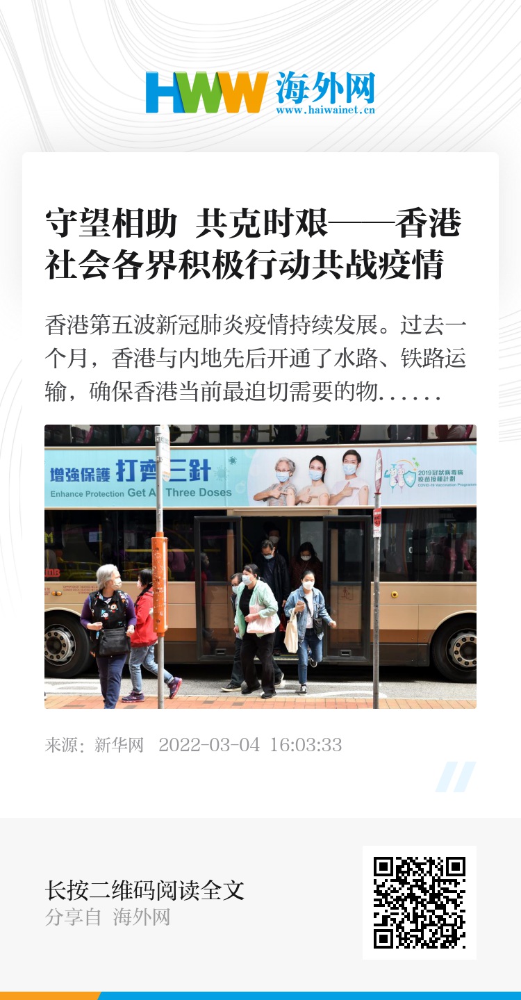 3月1日,在香港湾仔区一处街站,义工(左一)免费派送中央援港抗疫物资。新华社记者 李钢 摄 中国海外集团联同中国海外爱心基金会及中国建筑国际,2日向入住中央援建的青衣方舱医院人士派发首批200份爱心包并送上慰问卡,爱心包里有收音机、毛巾、梳洗用品、N95防护型口罩及酒精搓手液等。中国海外集团表示,疫情下,集团会继续尽一切努力,与社会同心抗疫。