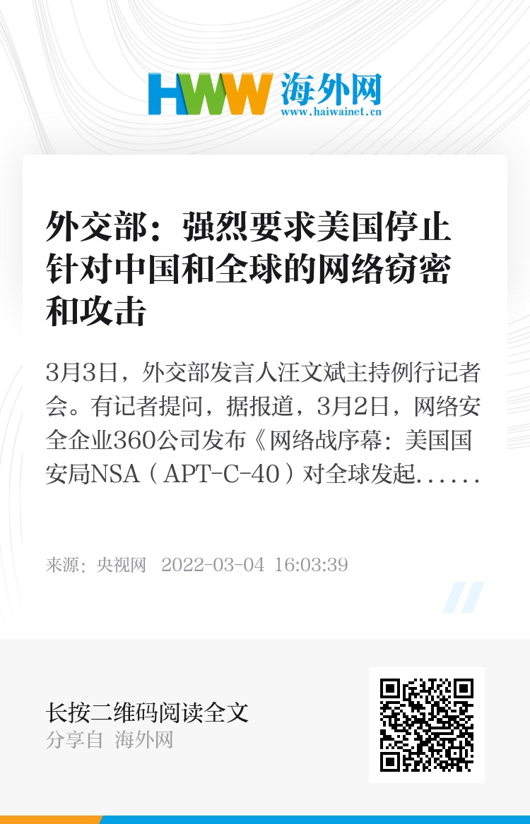 3月3日,外交部发言人汪文斌主持例行记者会。有记者提问,据报道,3月2日,网络安全企业360公司发布《网络战序幕:美国国安局NSA(APT-C-40)对全球发起长达十余年无差别攻击》的报告,披露NSA利用网络武器对中国、英国、德国、法国、波兰、日本、印度、韩国、阿联酋、南非、巴西等全球47个国家及地区403个目标开展网络攻击。此前,360公司还发布过APT-C-39报告,曝光美国中央情报局对中国发动大规模网络攻击。请问,中方对此有何评论?
