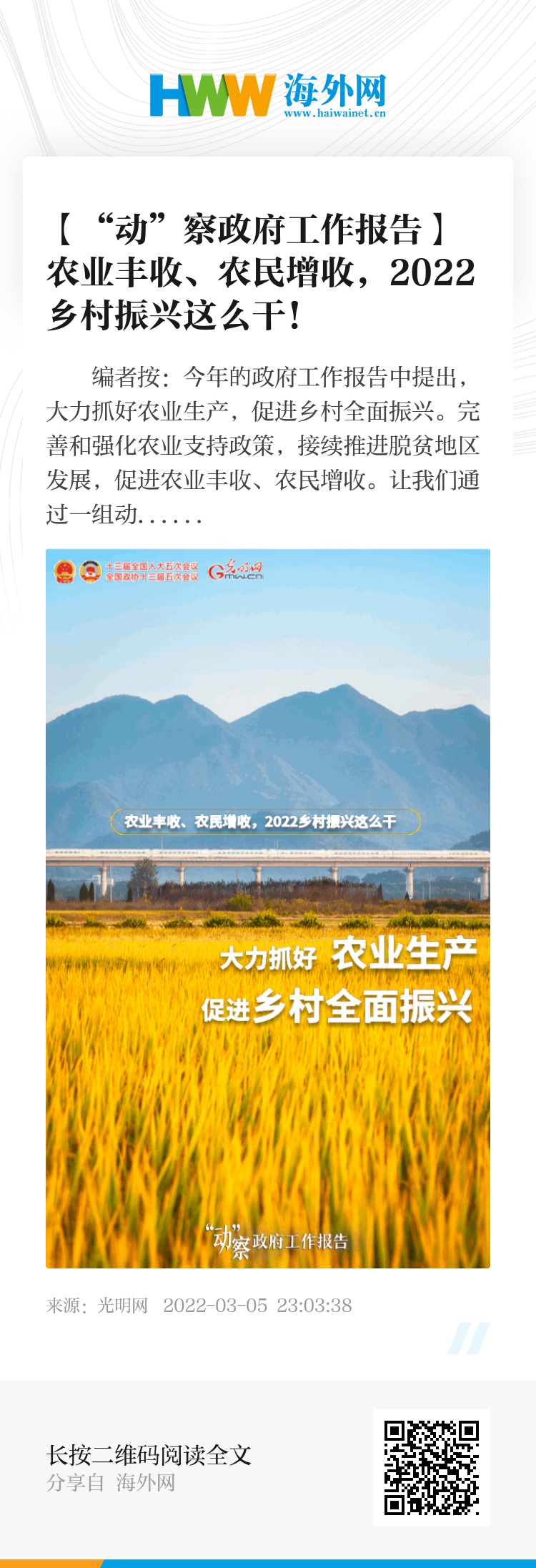 编者按:今年的政府工作报告中提出,大力抓好农业生产,促进乡村全面振兴。完善和强化农业支持政策,接续推进脱贫地区发展,促进农业丰收、农民增收。让我们通过一组动态海报,了解2022年政府工作报告中的乡村振兴关键词。