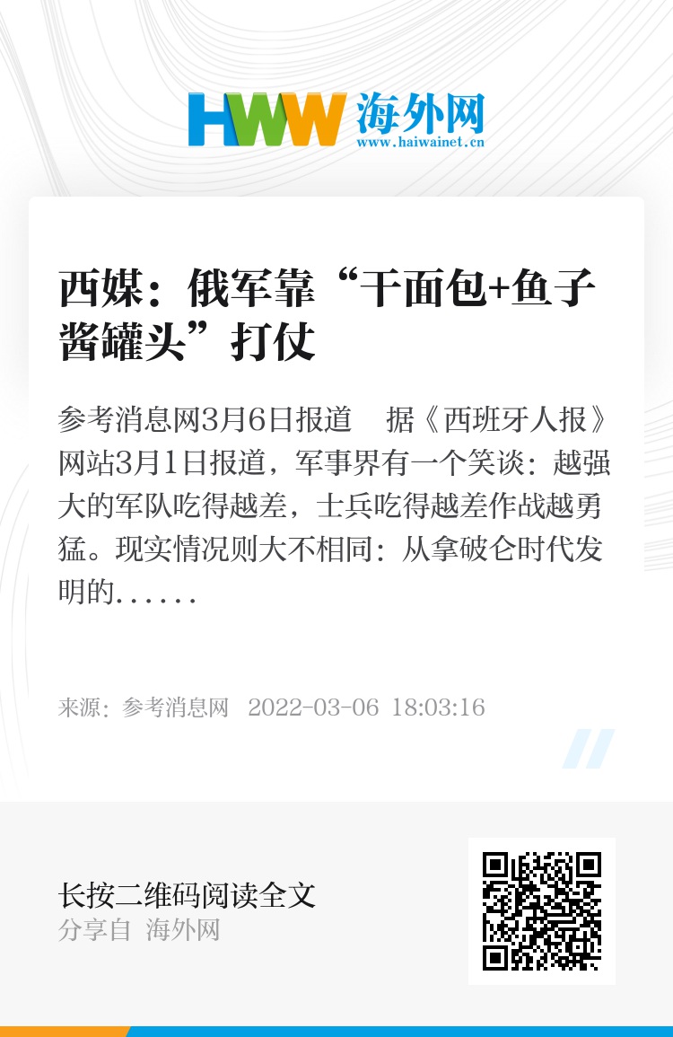 报道称,如果说“部队靠胃行军”(拿破仑的一句名言),那么苏联军队,作为一个能够调动超过400万兵力的庞然大物,当年靠的是干口粮。据库宾卡坦克博物馆介绍,类似于咸味饼干的干面包,自沙皇时代起一直是俄国士兵口粮的基础。苏联引入了牛肉罐头和马肉罐头,以及“图申卡”军用罐头。