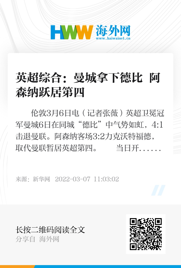 新华社伦敦3月6日电(记者张薇)英超卫冕冠军曼城6日在同城“德比”中气势如虹,4:1击退曼联。阿森纳客场3:2力克沃特福德,取代曼联暂居英超第四。