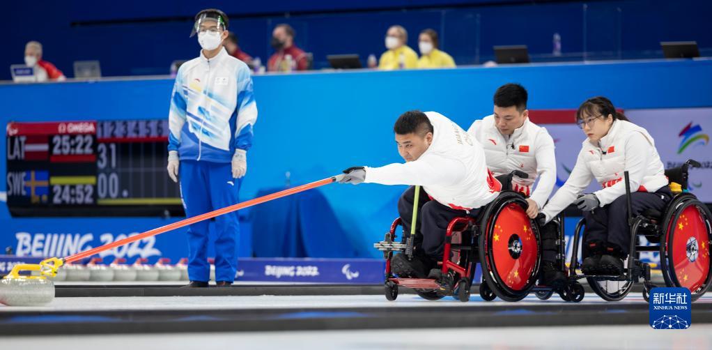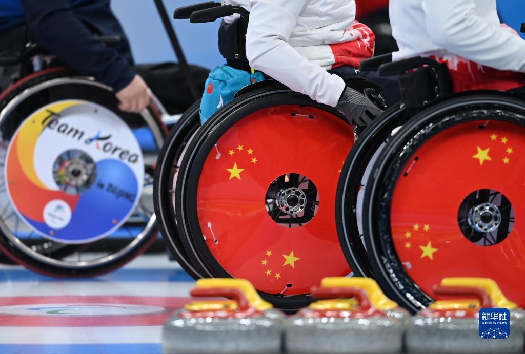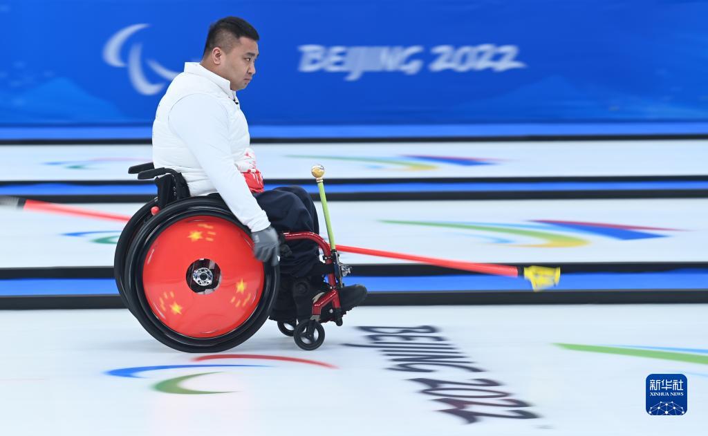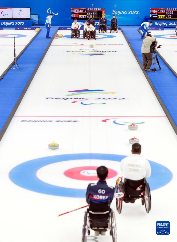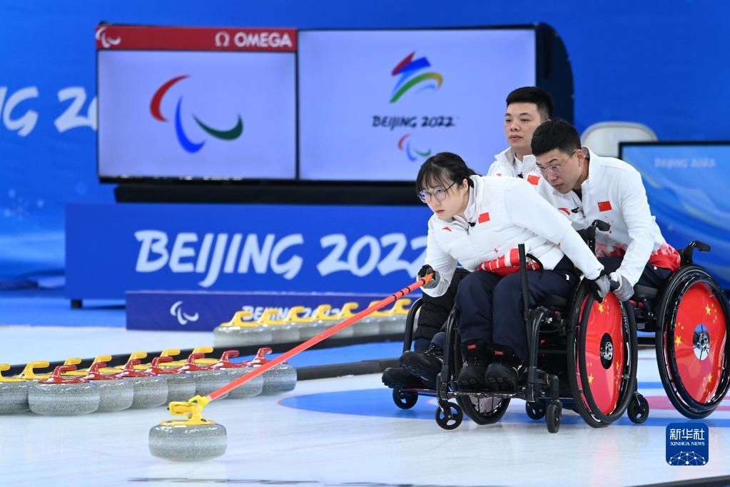3月7日,中国队选手闫卓(左一)在比赛中掷壶。当日,在北京国家游泳中心“冰立方”举行的北京2022年冬残奥会轮椅冰壶循环赛中,中国队以9比4战胜韩国队。新华社记者 任超 摄