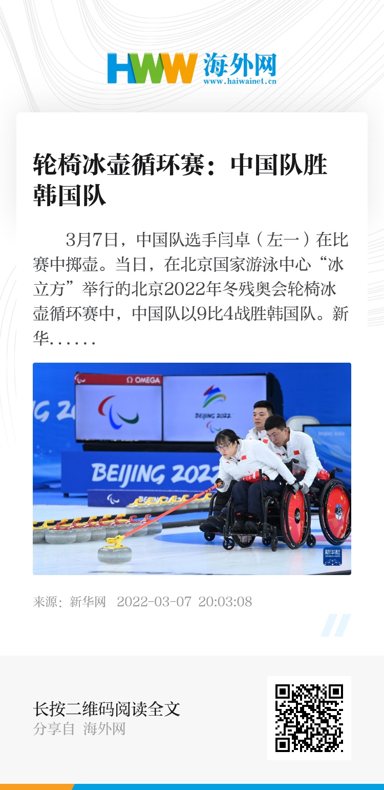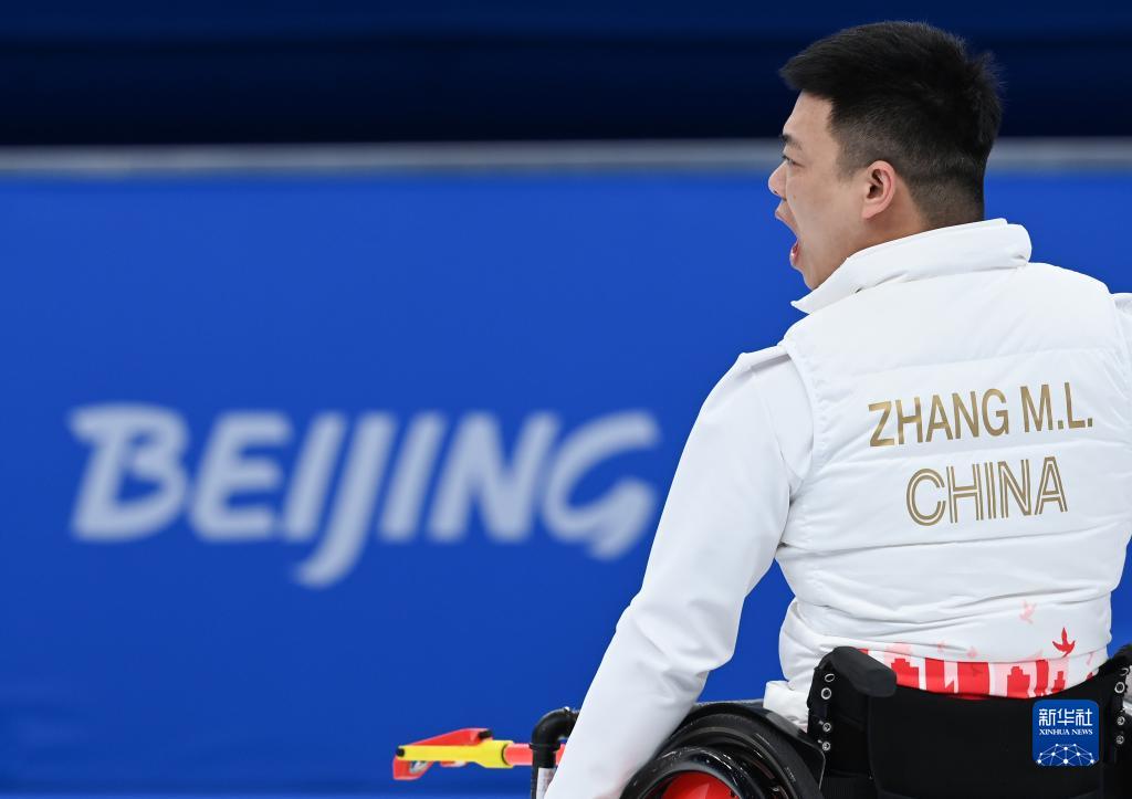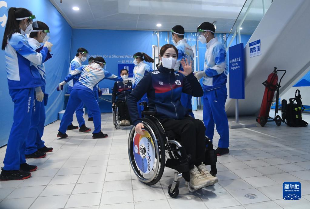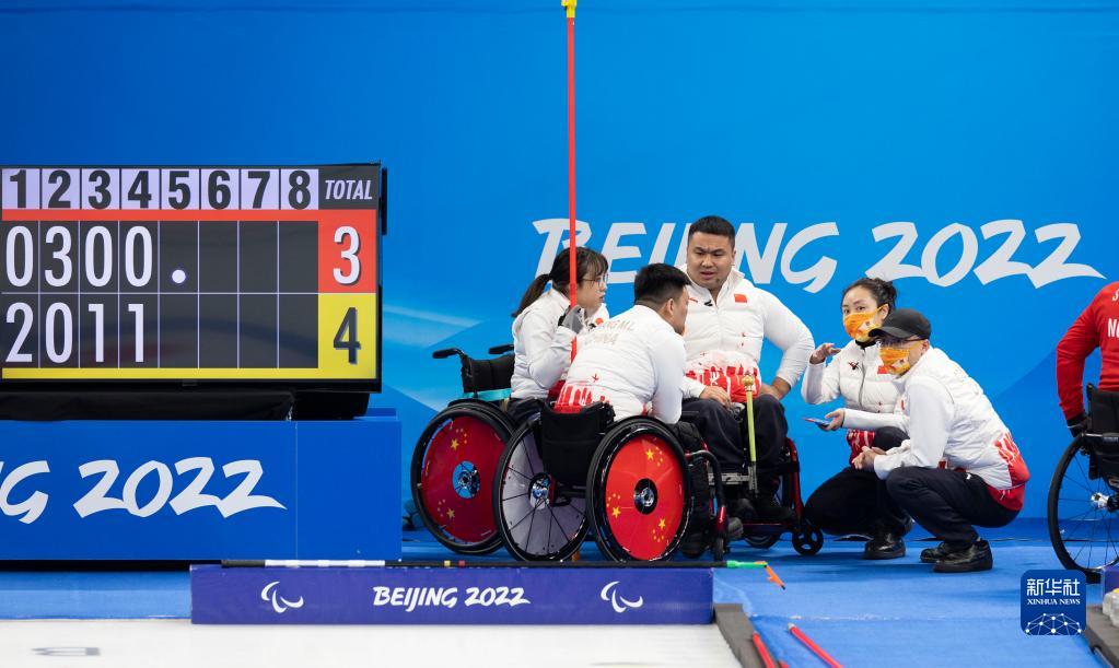 3月7日,中国队选手闫卓(左一)在比赛中掷壶。当日,在北京国家游泳中心“冰立方”举行的北京2022年冬残奥会轮椅冰壶循环赛中,中国队以9比4战胜韩国队。新华社记者 任超 摄