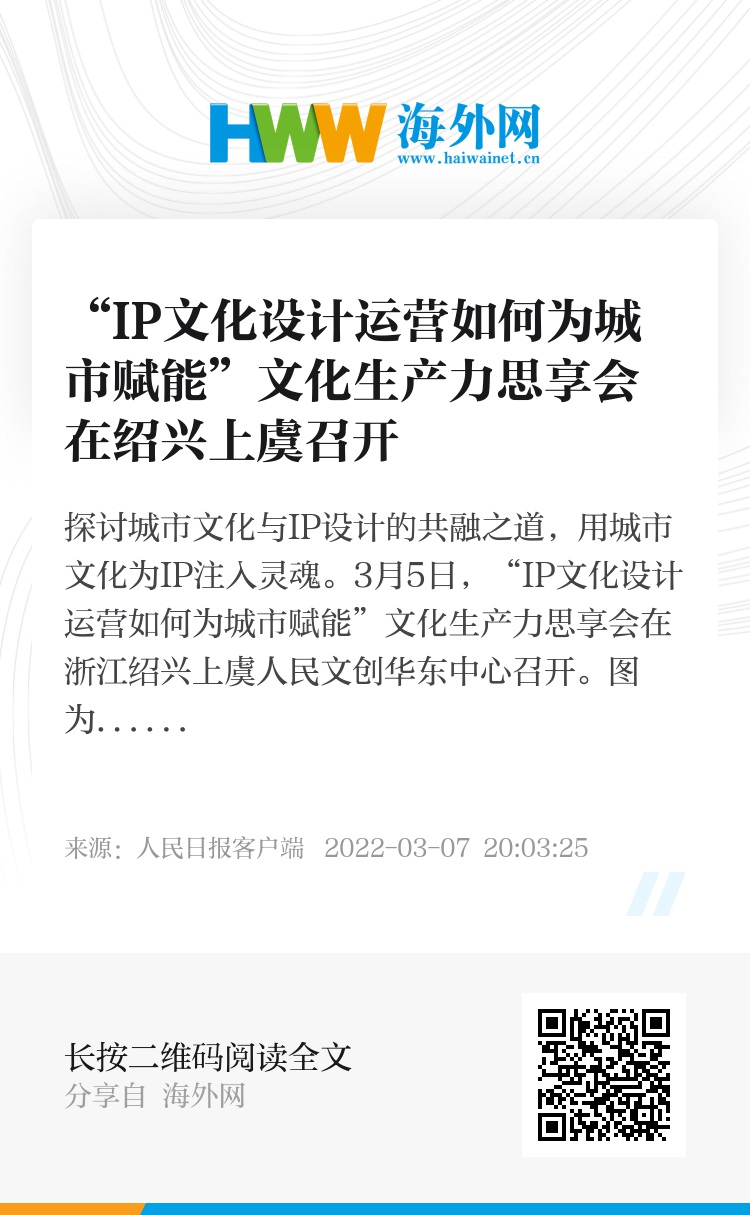 探讨城市文化与IP设计的共融之道,用城市文化为IP注入灵魂。3月5日,“IP文化设计运营如何为城市赋能”文化生产力思享会在浙江绍兴上虞人民文创华东中心召开。