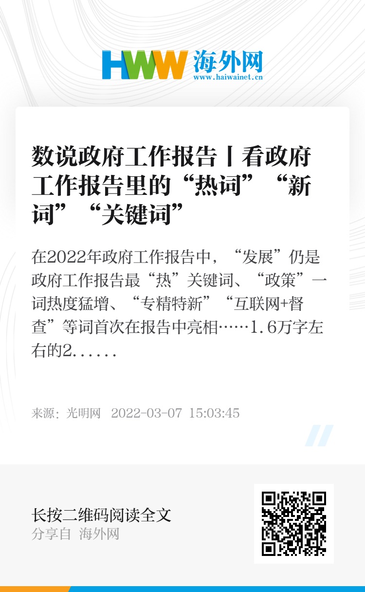 在2022年政府工作报告中,“发展”仍是政府工作报告最“热”关键词、“政策”一词热度猛增、“专精特新”“互联网+督查”等词首次在报告中亮相……1.6万字左右的2022年政府工作报告已新鲜出炉,快来用数据看看吧!(李汶键 赵艳艳)