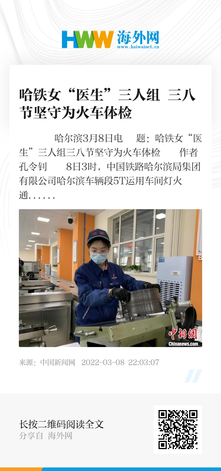 中新网哈尔滨3月8日电 题:哈铁女“医生”三人组三八节坚守为火车体检