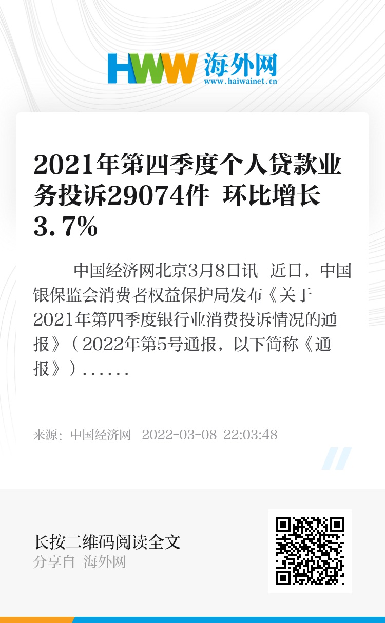 中国经济网北京3月8日讯 近日,中国银保监会消费者权益保护局发布《关于2021年第四季度银行业消费投诉情况的通报》(2022年第5号通报,以下简称《通报》),通报了银保监会及其派出机构接收并转送的银行业消费投诉情况。