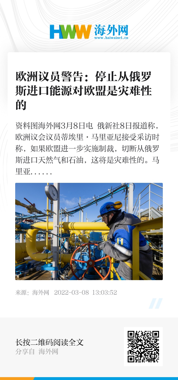 海外网3月8日电 俄新社8日报道称,欧洲议会议员蒂埃里·马里亚尼接受采访时称,如果欧盟进一步实施制裁,切断从俄罗斯进口天然气和石油,这将是灾难性的。