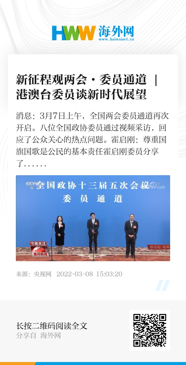 全国政协委员 霍启刚:国旗跟国歌代表了我们国家,是我们国家的象征。我希望,香港所有的学校以及以后推广的所有青少年活动、爱国主义活动要更重视国歌跟国旗的教育,而且要从娃娃抓起。