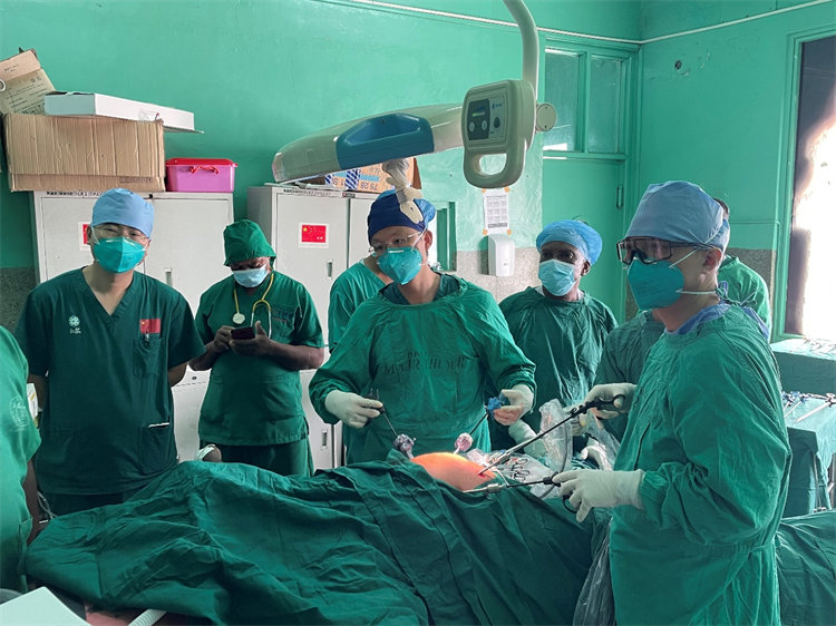 3月8日,中坦两国医护人员合作展开坦桑尼亚史上首例腹腔镜下胃恶性肿瘤根治性切除手术。第31期中国援桑给巴尔岛医疗队供图