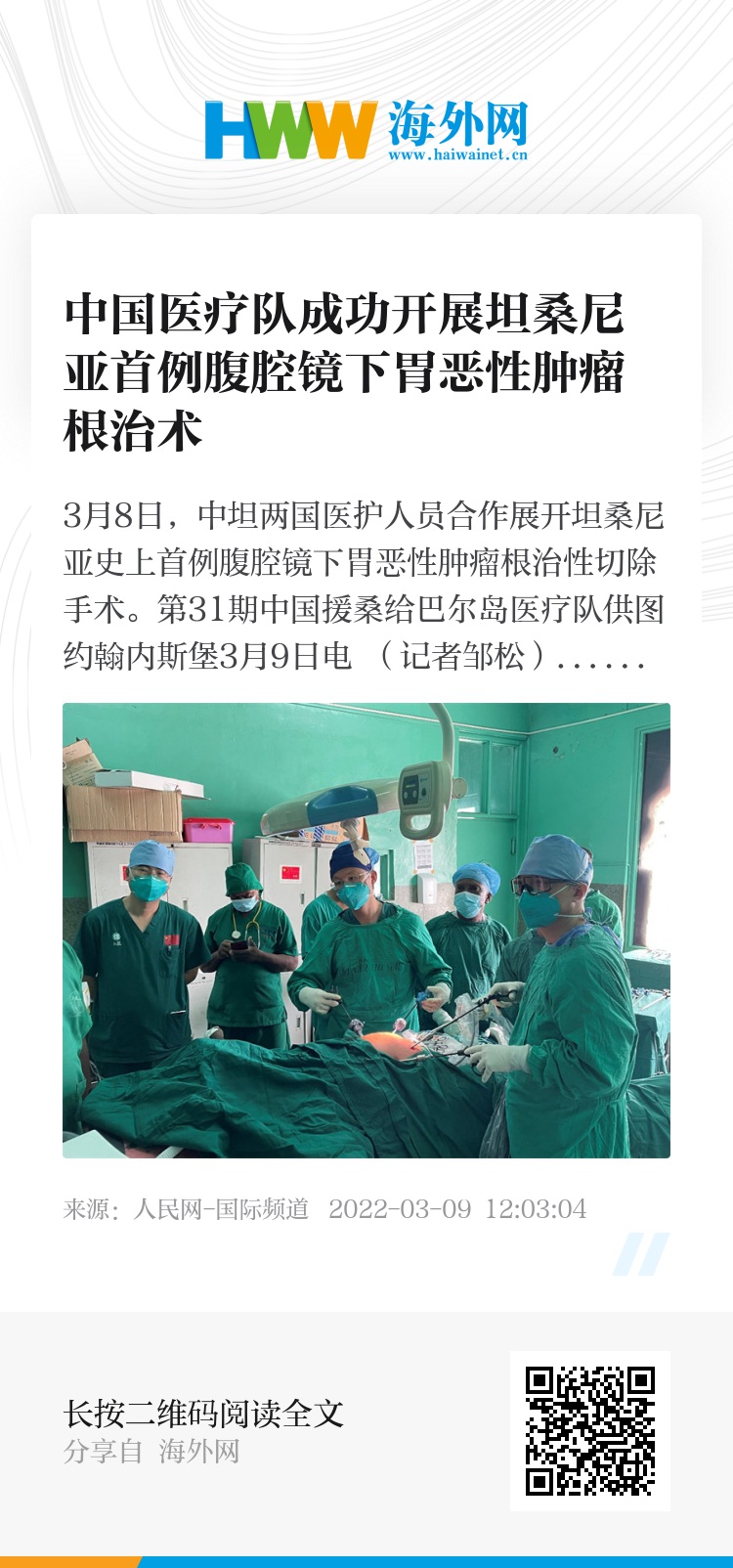 人民网约翰内斯堡3月9日电 (记者邹松)第31期中国援桑给巴尔岛医疗队8日晚在桑给巴尔岛纳兹莫加医院成功完成坦桑尼亚史上首例腹腔镜下胃恶性肿瘤根治性切除手术。