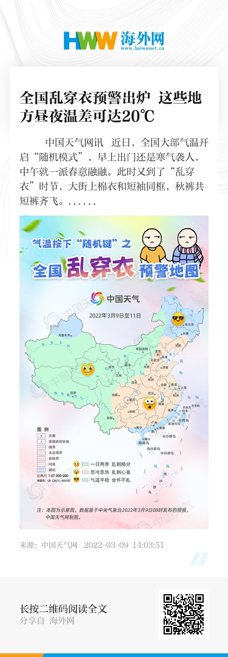 中国天气网讯 近日,全国大部气温开启“随机模式”,早上出门还是寒气袭人,中午就一派春意融融。此时又到了“乱穿衣”时节,大街上棉衣和短袖同框,秋裤共短裤齐飞。每天醒来发愁的不是吃什么,而是出门穿什么。中国天气网贴心奉上全国乱穿衣预警地图,看看哪里气温最任性,还有实用穿衣指南,让你在任性的天气里穿衣不发愁。