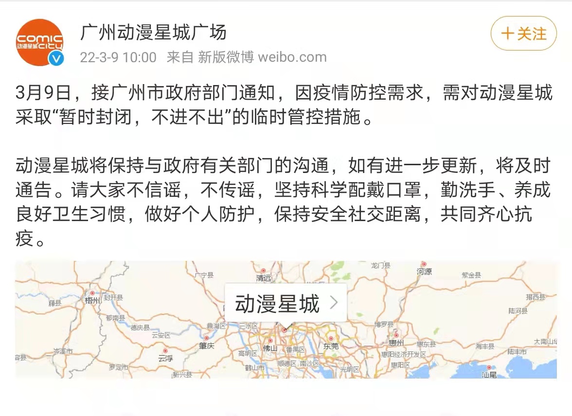 南方网讯 (记者/李润芳 )3月9日,广州天河城、广州动漫星城广场官方微博发布消息,接广州市政府部门通知,因疫情防控需求,需对广州天河城购物中心、动漫星城采取“暂时封闭,不进不出”的临时管控措施。