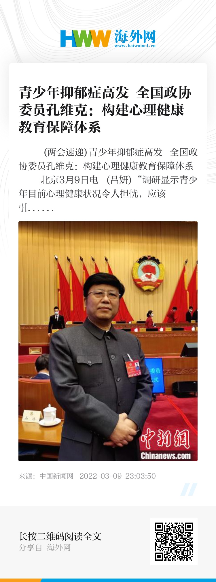 (两会速递)青少年抑郁症高发 全国政协委员孔维克:构建心理健康教育保障体系