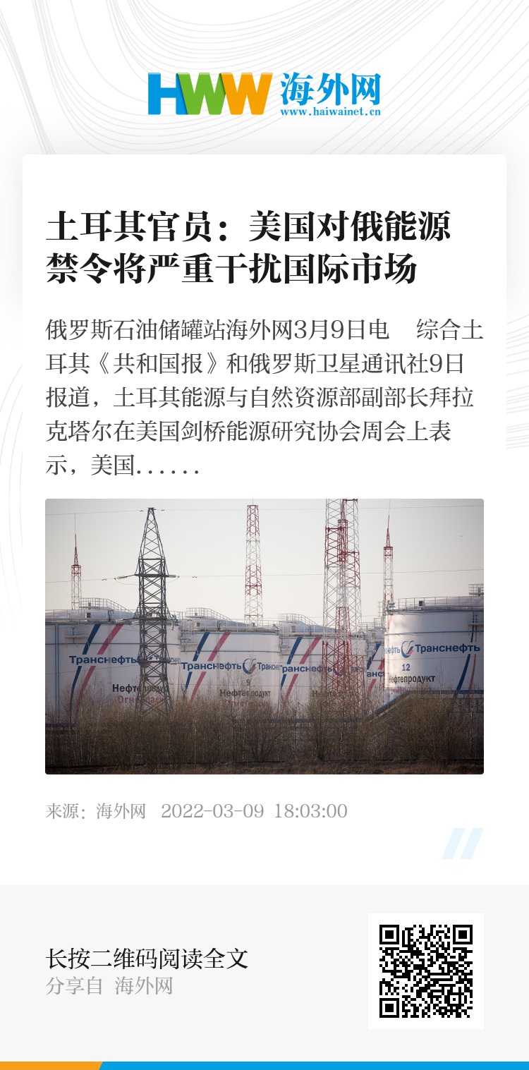 海外网3月9日电 综合土耳其《共和国报》和俄罗斯卫星通讯社9日报道,土耳其能源与自然资源部副部长拜拉克塔尔在美国剑桥能源研究协会周会上表示,美国对俄罗斯能源部门的制裁决定将严重干扰国际市场。