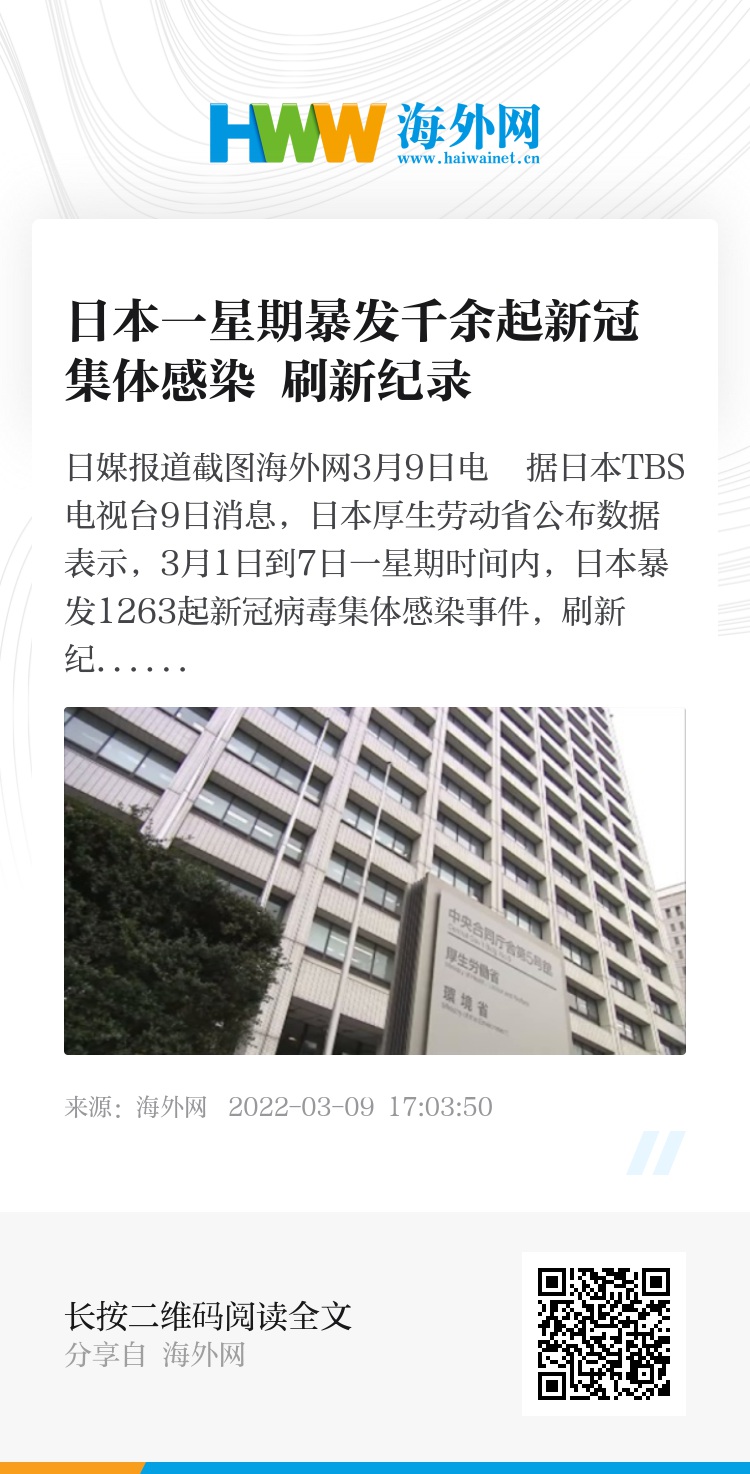 海外网3月9日电 据日本TBS电视台9日消息,日本厚生劳动省公布数据表示,3月1日到7日一星期时间内,日本暴发1263起新冠病毒集体感染事件,刷新纪录。